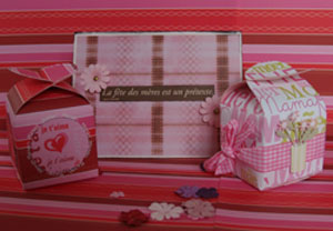 Grâce au scrap, les idées de cadeaux ne manquent pas : des pages de scrap, des des cadres, des mini-albums, des canvas,… et même de petites boîtes comme celles présentées en image. Ces boites avec une fermeture en forme de cœur dont vous pourrez télécharger le gabarit sur le site de la Scrapbookerie : http://www.scrapbookerie.com/fr/Formation/Boites.aspx, peuvent être remplis de petits mots, de petits bonbons, de pétales de fleurs,….