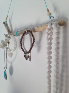 Après avoir travaillé le béton, elle travaille aujourd’hui beaucoup autour du bois et notamment du bois flotté. « C’est un véritable bonheur de travailler des matériaux nobles et qui portent sur eux les traces de leur vie passée… J’ai la chance d’habiter dans une région magnifique, entourée de lacs naturels et de rivières… Le bois flotté ne se trouve pas qu’au bord de la mer ! Ce bois flotté est moins blanchi que celui du bord de mer mais il porte les stigmates de la rivière qui l’a façonné… certains sont noircis, d’autres comme sablés… Tous différents, tous uniques. »