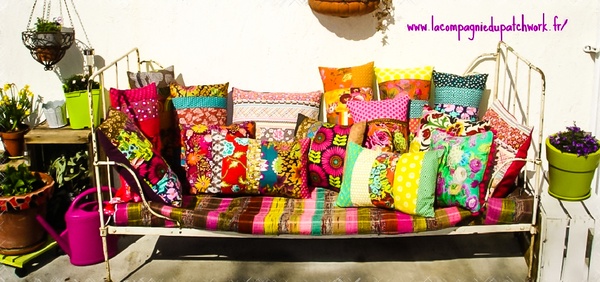 « Je prends beaucoup de plaisir à prendre des mélanges les coussins en photo en composant des « patchworks de coussins . J’ai même une caravane qui me sert de cadre pour cela et un grand jardin qui regorge de possibilités de mises en scène. »