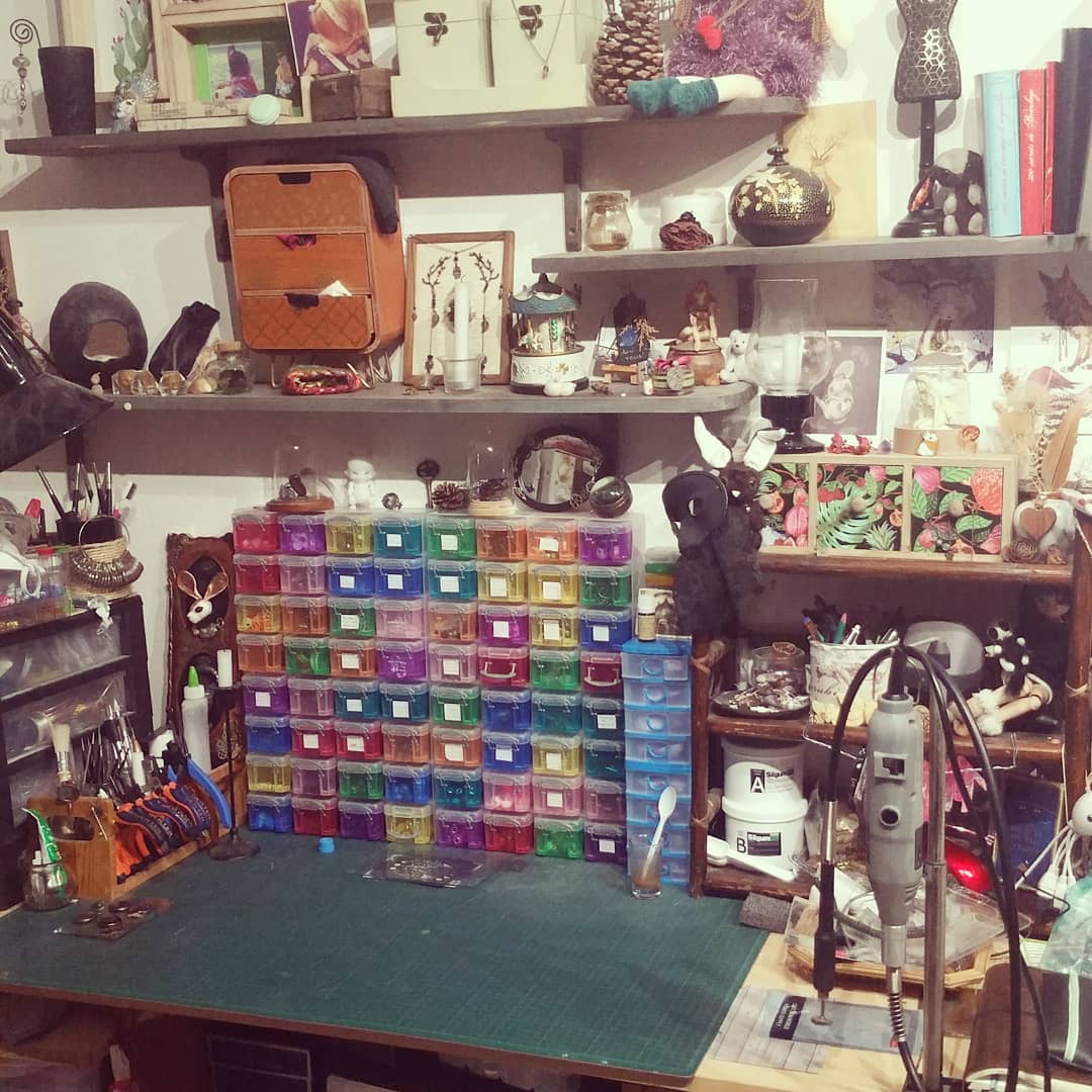 « Un souci d’hyperlaxité ne me permet pas d’avoir assez de force dans les mains et les doigts pour la Fimo » Mais elle aime de plus en plus travailler la résine. « Les possibilités infinies avec ce produit me comble de joie. Je suis constamment à tester de nouvelles choses avec. »