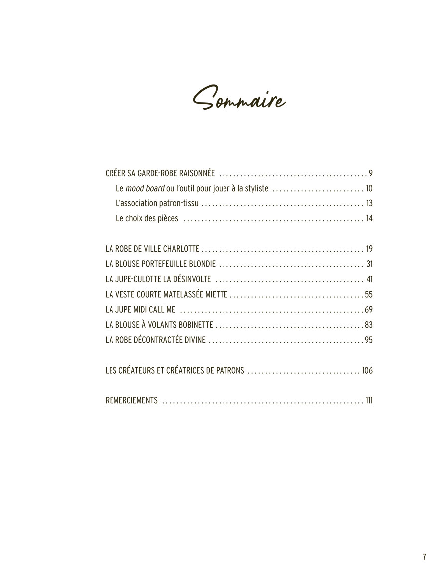 Dans cet ouvrage, Eve sélectionne sept patrons printemps-été, dont la pièce centrale est Miette, la veste courte matelassée. Six de ces patrons sont des pièces emblématiques de créatrices, que Petite Bobine décline dans des versions inédites : la veste Miette et la blouse Bobinette de Singulière par Cousette, la blouse Blondie de Un chat sur un fil, la jupe-culotte La Désinvolte de Popeline et Linon, la jupe Call Me de Dress Your Body et la blouse Divine déclinée en robe décontractée de Maison Essentielle. À cela s’ajoute la robe de ville Charlotte imaginée en collaboration avec Cha’Coud spécialement pour ce vestiaire. Ces sept pièces constituent un vestiaire coordonné, équilibré et tendance.
